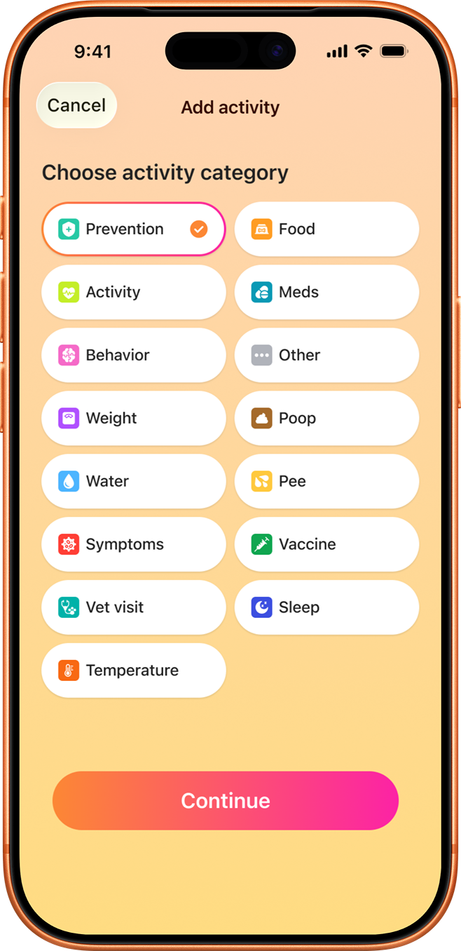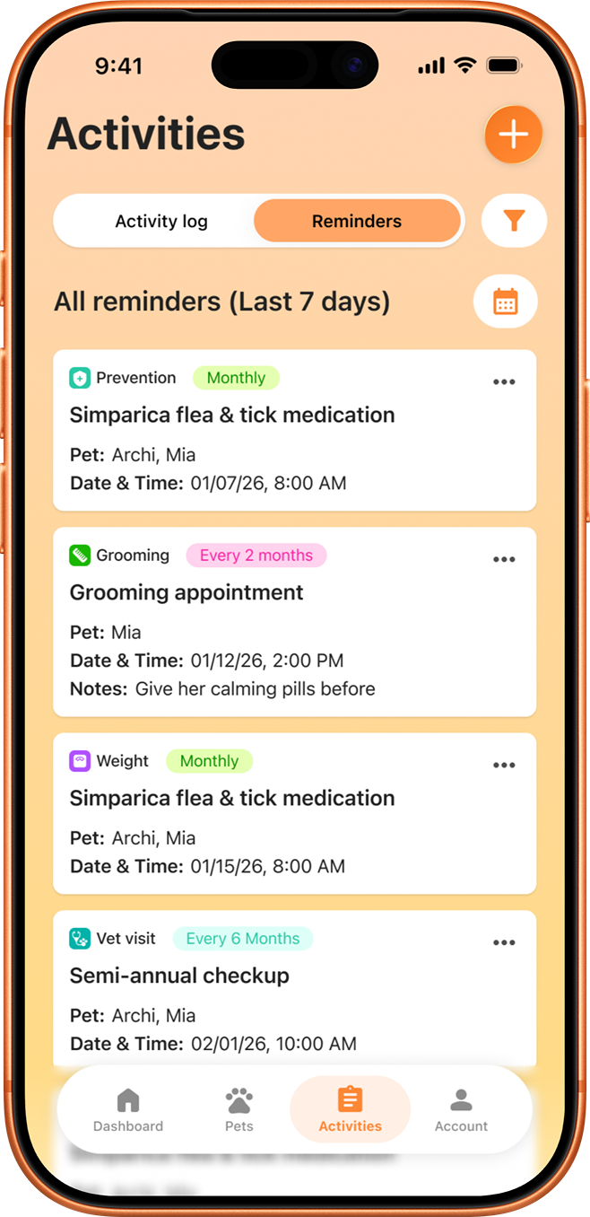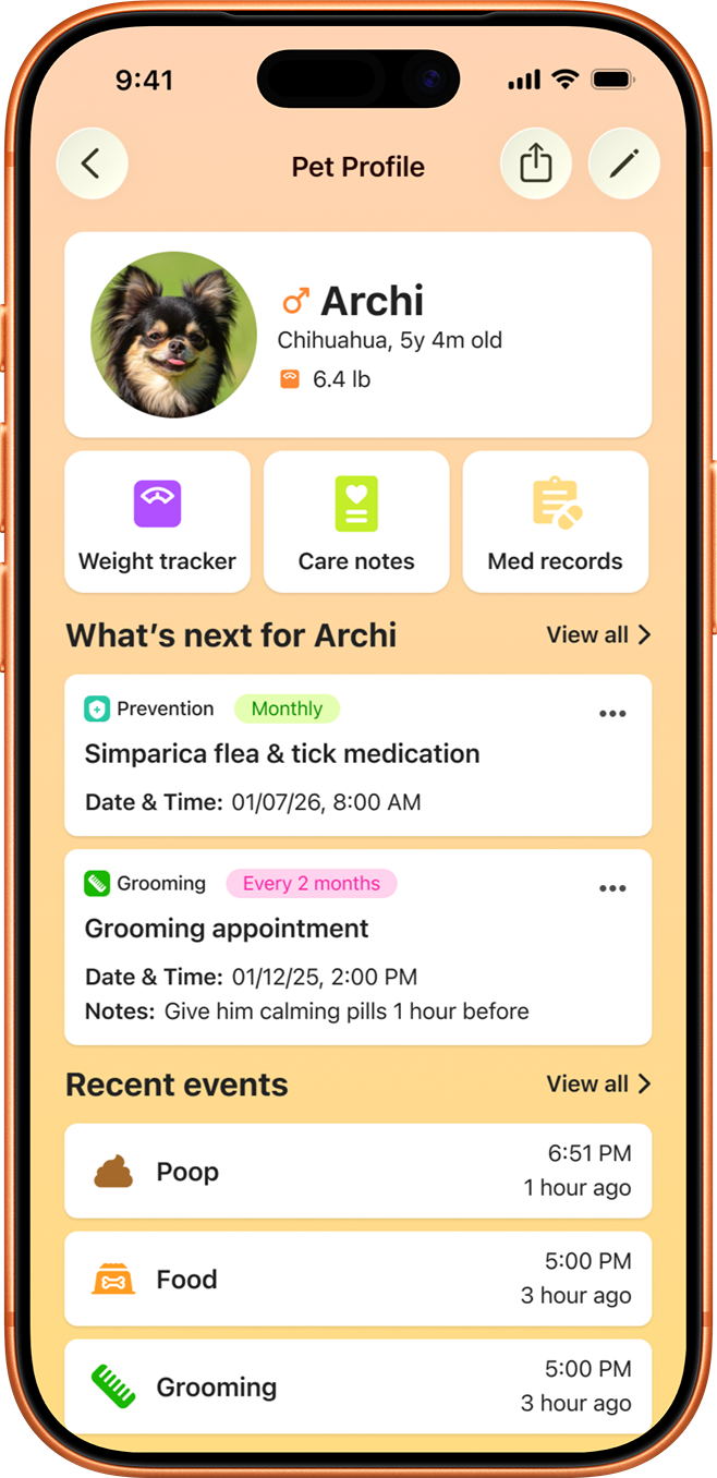 Organize care by what you actually do: meds, preventatives, grooming, training, walk & more.